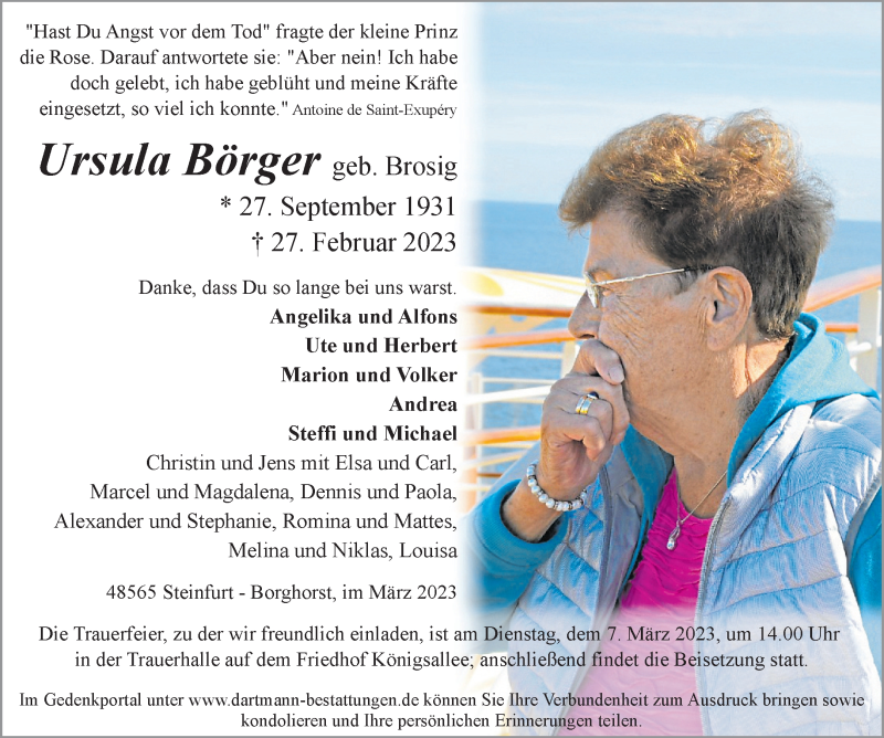 Hier finden Sie alle Traueranzeigen aus der Zeitung, die bisher für Ursula Börger erschienen sind. Weitere Traueranzeigen, die in der Zeitung erscheinen, werden hier ebenfalls aufgelistet