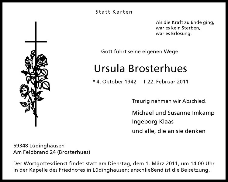 Hier finden Sie alle Traueranzeigen aus der Zeitung, die bisher für Ursula Brosterhues erschienen sind. Weitere Traueranzeigen, die in der Zeitung erscheinen, werden hier ebenfalls aufgelistet