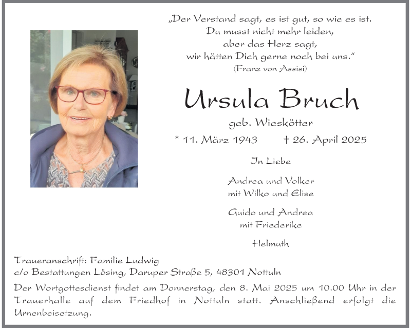 Hier finden Sie alle Traueranzeigen aus der Zeitung, die bisher für Ursula Bruch erschienen sind. Weitere Traueranzeigen, die in der Zeitung erscheinen, werden hier ebenfalls aufgelistet