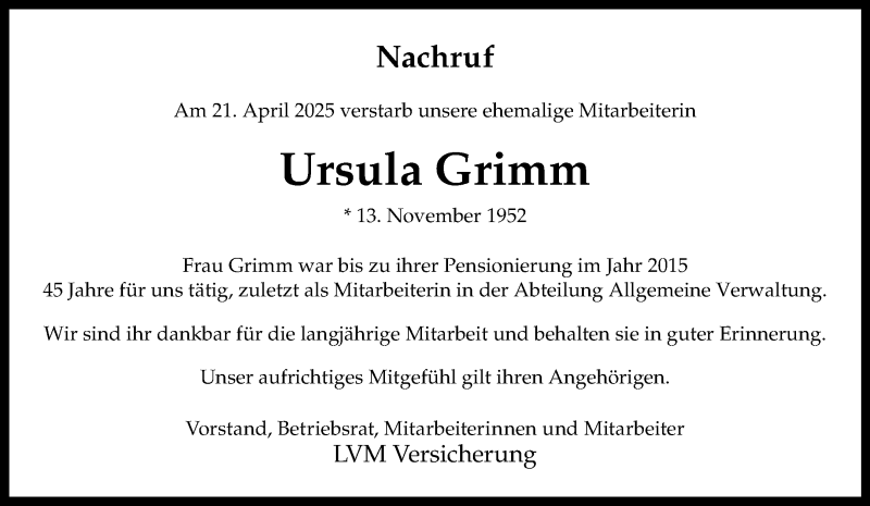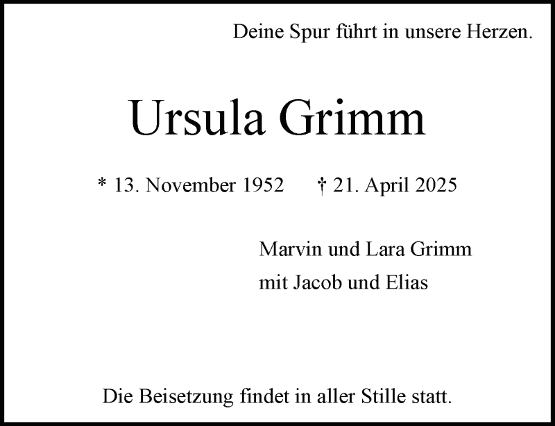 Hier finden Sie alle Traueranzeigen aus der Zeitung, die bisher für Ursula Grimm erschienen sind. Weitere Traueranzeigen, die in der Zeitung erscheinen, werden hier ebenfalls aufgelistet