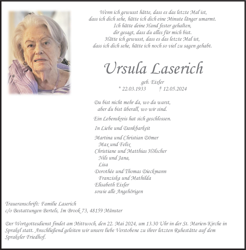 Hier finden Sie alle Traueranzeigen aus der Zeitung, die bisher für Ursula Laserich erschienen sind. Weitere Traueranzeigen, die in der Zeitung erscheinen, werden hier ebenfalls aufgelistet
