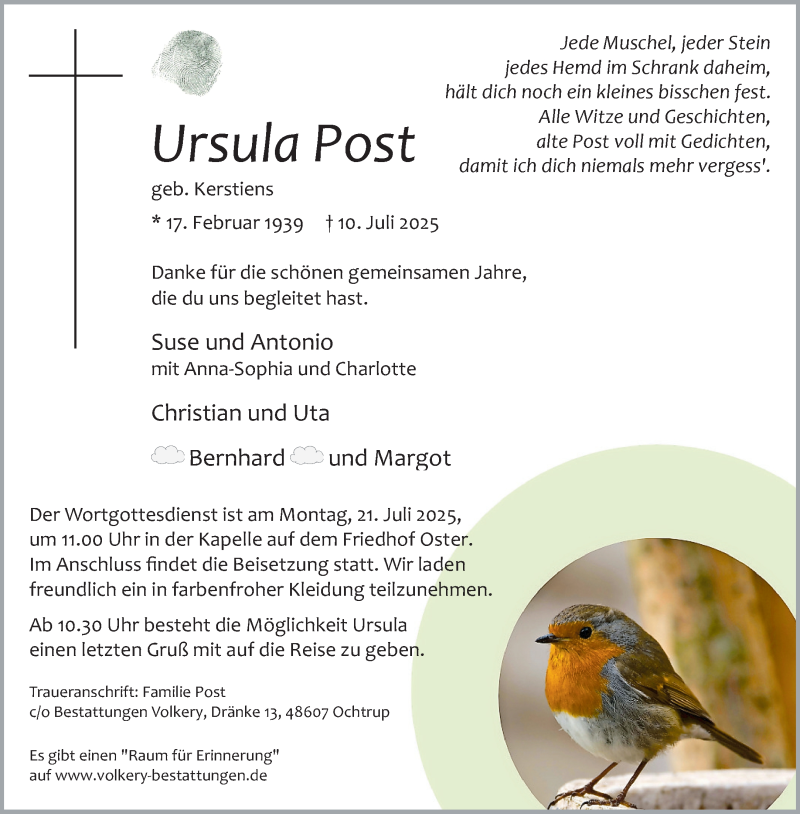 Hier finden Sie alle Traueranzeigen aus der Zeitung, die bisher für Ursula Post erschienen sind. Weitere Traueranzeigen, die in der Zeitung erscheinen, werden hier ebenfalls aufgelistet