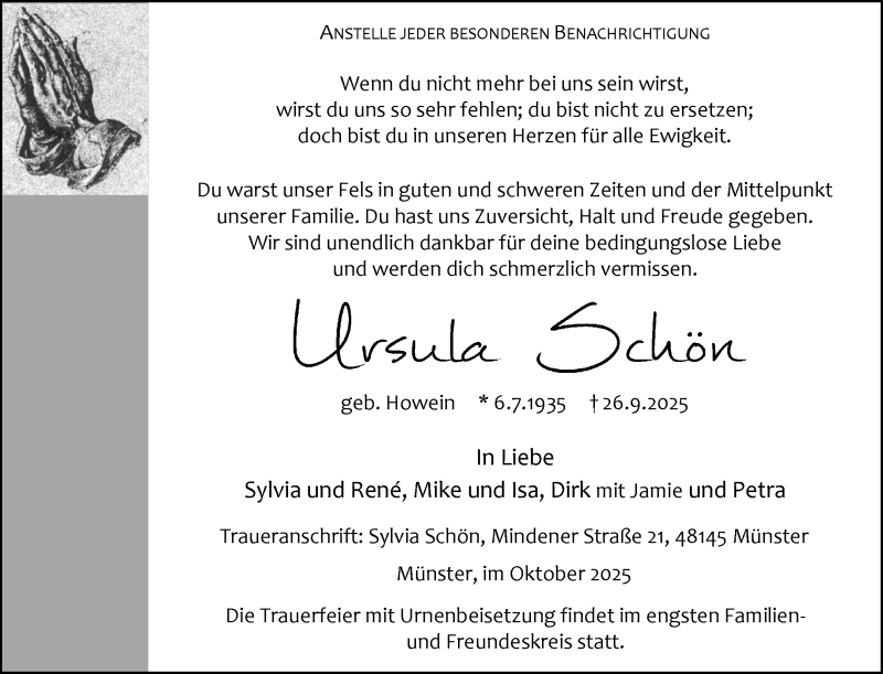 Hier finden Sie alle Traueranzeigen aus der Zeitung, die bisher für Ursula Schön erschienen sind. Weitere Traueranzeigen, die in der Zeitung erscheinen, werden hier ebenfalls aufgelistet