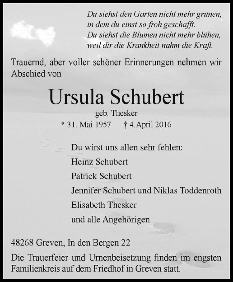 Hier finden Sie alle Traueranzeigen aus der Zeitung, die bisher für Ursula Schubert erschienen sind. Weitere Traueranzeigen, die in der Zeitung erscheinen, werden hier ebenfalls aufgelistet