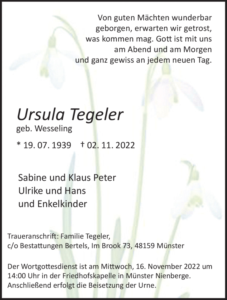 Hier finden Sie alle Traueranzeigen aus der Zeitung, die bisher für Ursula Tegeler erschienen sind. Weitere Traueranzeigen, die in der Zeitung erscheinen, werden hier ebenfalls aufgelistet