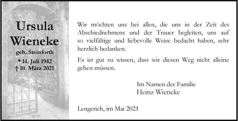 Hier finden Sie alle Traueranzeigen aus der Zeitung, die bisher für Ursula Wieneke erschienen sind. Weitere Traueranzeigen, die in der Zeitung erscheinen, werden hier ebenfalls aufgelistet