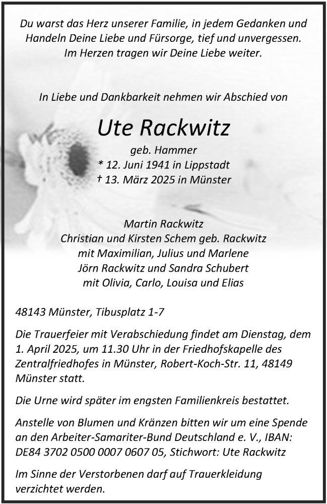 Hier finden Sie alle Traueranzeigen aus der Zeitung, die bisher für Ute Rackwitz erschienen sind. Weitere Traueranzeigen, die in der Zeitung erscheinen, werden hier ebenfalls aufgelistet