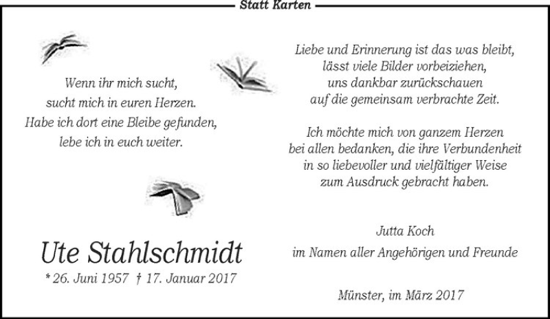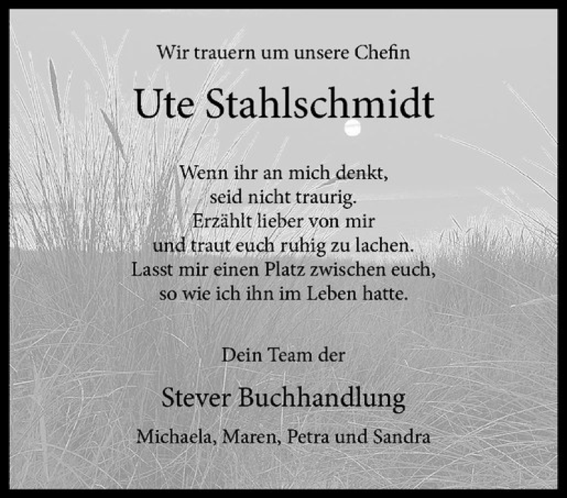 Hier finden Sie alle Traueranzeigen aus der Zeitung, die bisher für Ute Stahlschmidt erschienen sind. Weitere Traueranzeigen, die in der Zeitung erscheinen, werden hier ebenfalls aufgelistet