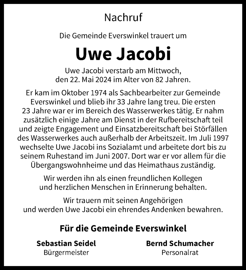 Hier finden Sie alle Traueranzeigen aus der Zeitung, die bisher für Uwe Jacobi erschienen sind. Weitere Traueranzeigen, die in der Zeitung erscheinen, werden hier ebenfalls aufgelistet