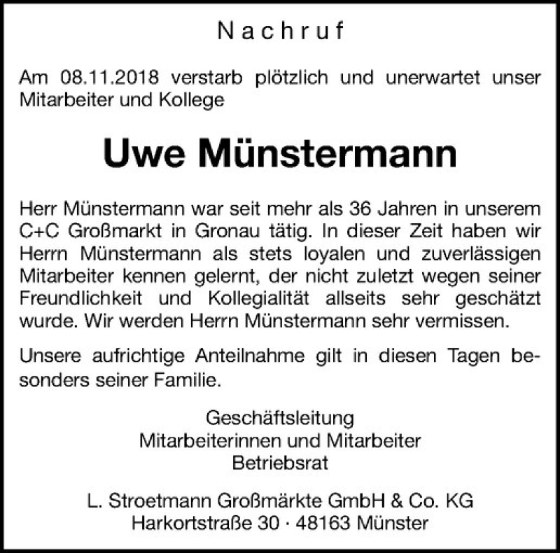 Hier finden Sie alle Traueranzeigen aus der Zeitung, die bisher für Uwe Münstermann erschienen sind. Weitere Traueranzeigen, die in der Zeitung erscheinen, werden hier ebenfalls aufgelistet