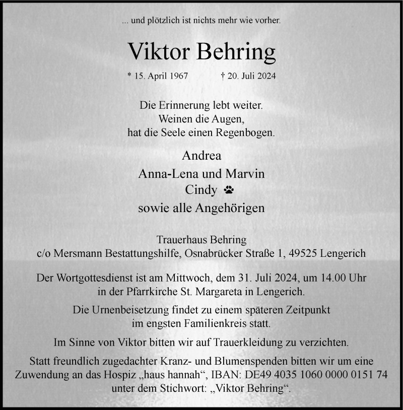Hier finden Sie alle Traueranzeigen aus der Zeitung, die bisher für Viktor Behring erschienen sind. Weitere Traueranzeigen, die in der Zeitung erscheinen, werden hier ebenfalls aufgelistet