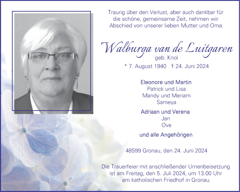 Hier finden Sie alle Traueranzeigen aus der Zeitung, die bisher für Walburga van de Luitgaren erschienen sind. Weitere Traueranzeigen, die in der Zeitung erscheinen, werden hier ebenfalls aufgelistet
