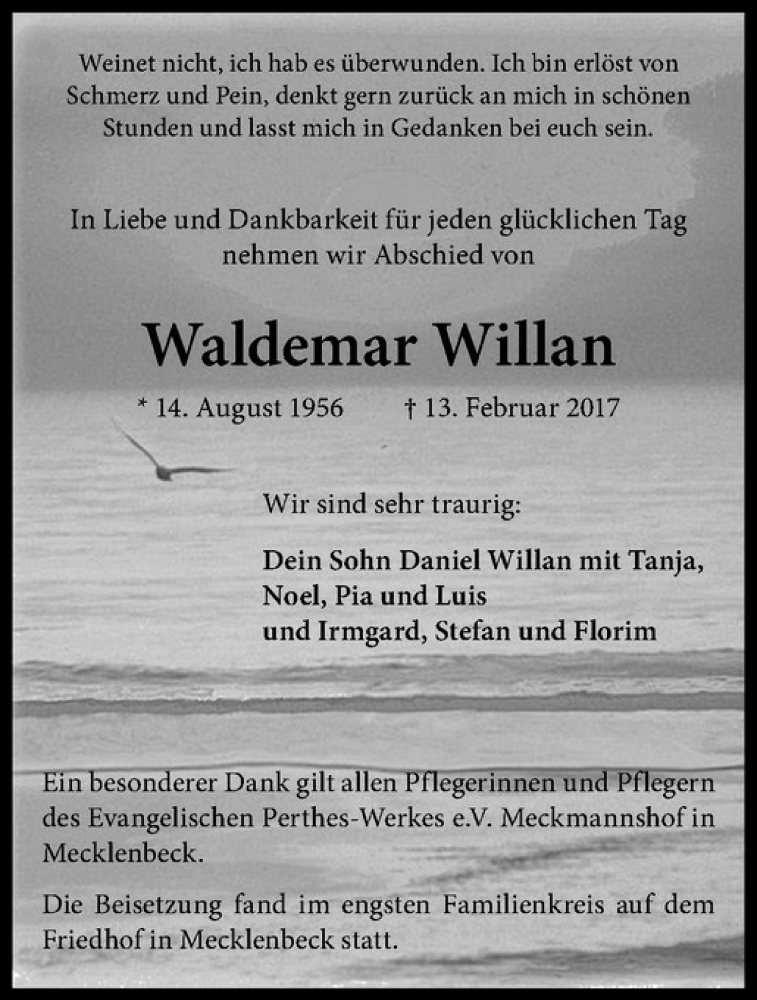 Hier finden Sie alle Traueranzeigen aus der Zeitung, die bisher für Waldemar Willan erschienen sind. Weitere Traueranzeigen, die in der Zeitung erscheinen, werden hier ebenfalls aufgelistet