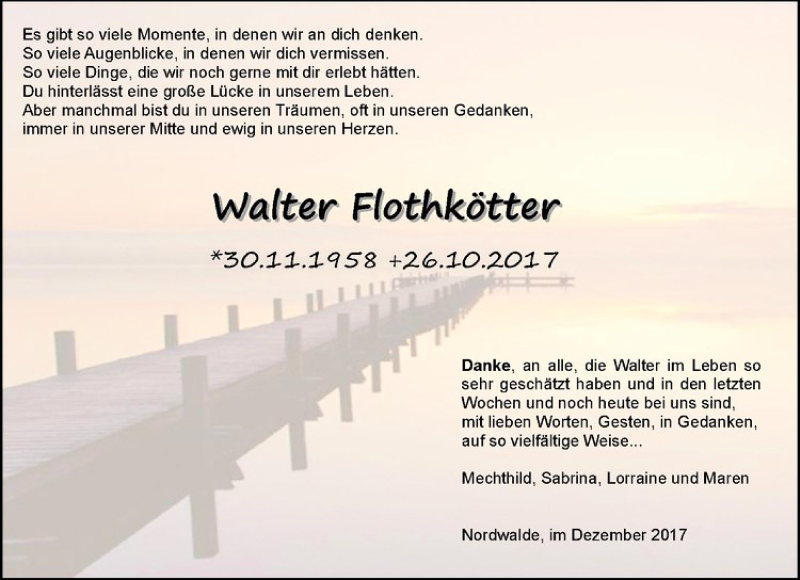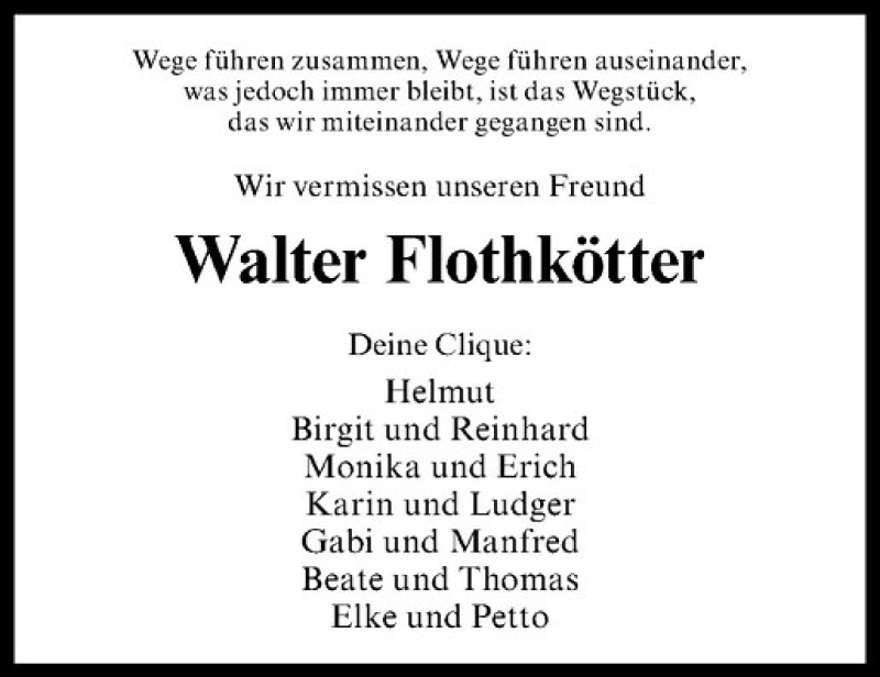 Hier finden Sie alle Traueranzeigen aus der Zeitung, die bisher für Walter Flothkötter erschienen sind. Weitere Traueranzeigen, die in der Zeitung erscheinen, werden hier ebenfalls aufgelistet