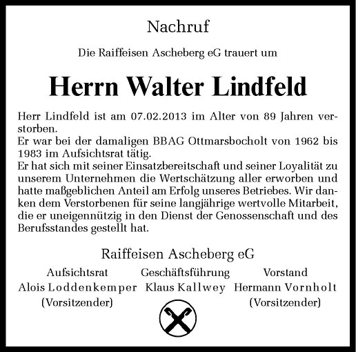 Hier finden Sie alle Traueranzeigen aus der Zeitung, die bisher für Walter Lindfeld erschienen sind. Weitere Traueranzeigen, die in der Zeitung erscheinen, werden hier ebenfalls aufgelistet
