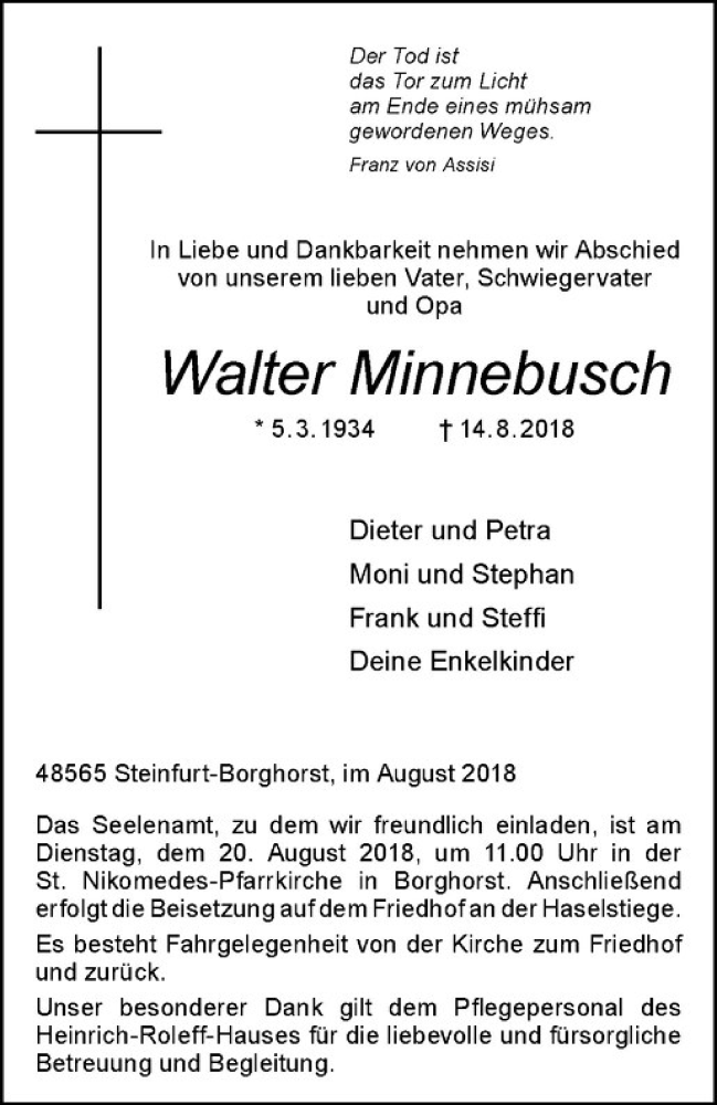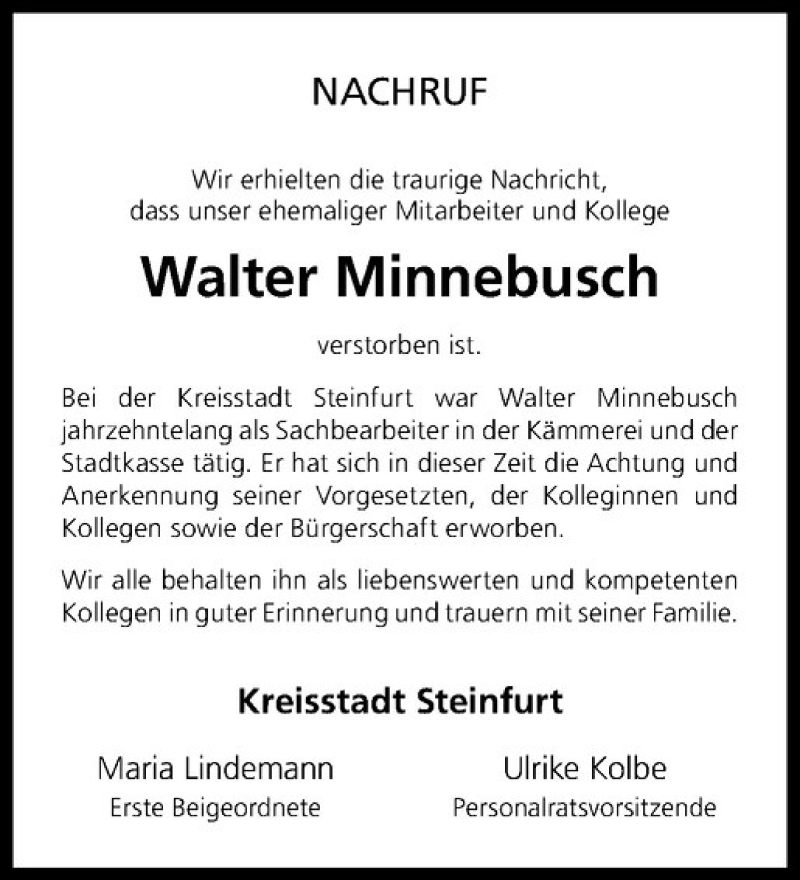 Hier finden Sie alle Traueranzeigen aus der Zeitung, die bisher für Walter Minnebusch erschienen sind. Weitere Traueranzeigen, die in der Zeitung erscheinen, werden hier ebenfalls aufgelistet