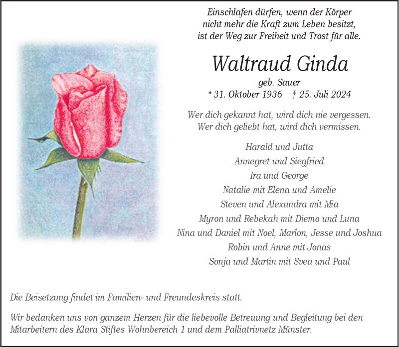 Hier finden Sie alle Traueranzeigen aus der Zeitung, die bisher für Waltraud Ginda erschienen sind. Weitere Traueranzeigen, die in der Zeitung erscheinen, werden hier ebenfalls aufgelistet