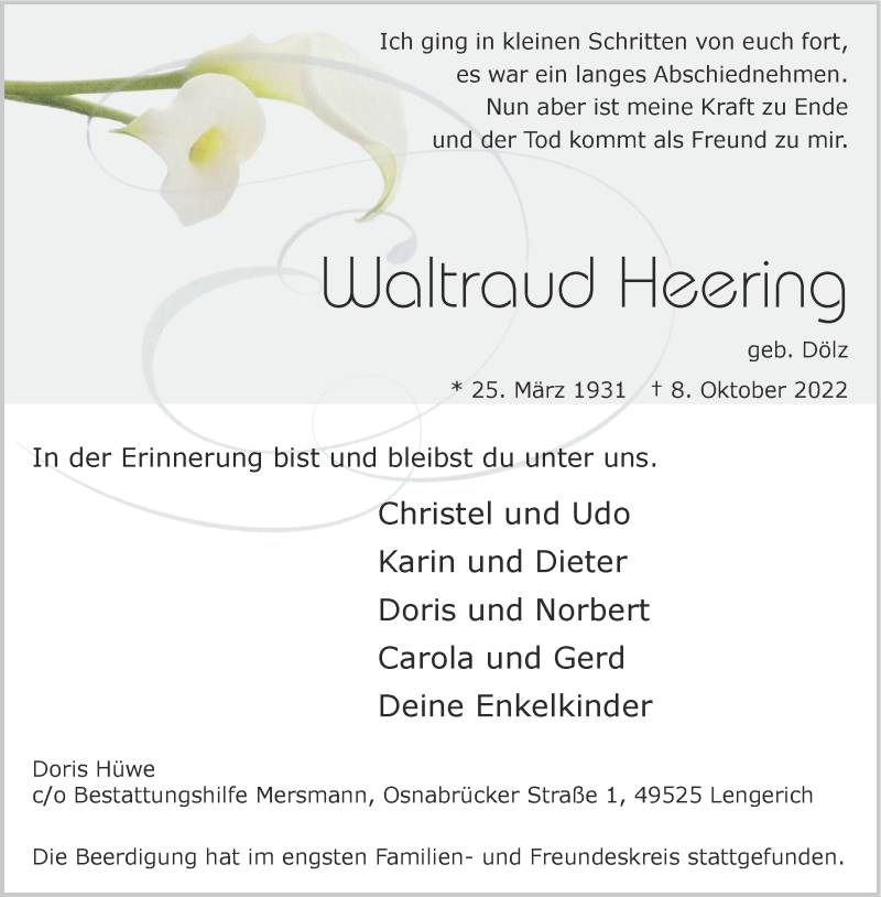 Hier finden Sie alle Traueranzeigen aus der Zeitung, die bisher für Waltraud Heering erschienen sind. Weitere Traueranzeigen, die in der Zeitung erscheinen, werden hier ebenfalls aufgelistet