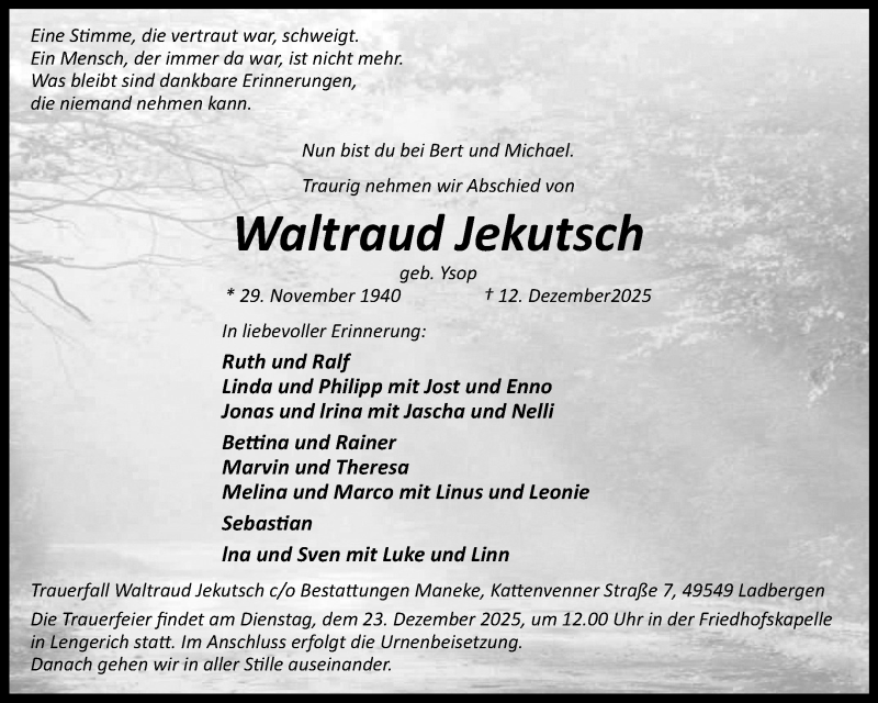 Hier finden Sie alle Traueranzeigen aus der Zeitung, die bisher für Waltraud Jekutsch erschienen sind. Weitere Traueranzeigen, die in der Zeitung erscheinen, werden hier ebenfalls aufgelistet