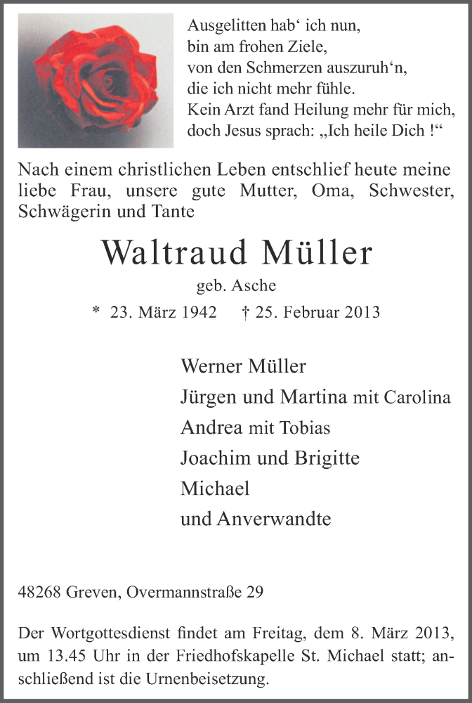 Hier finden Sie alle Traueranzeigen aus der Zeitung, die bisher für Waltraud Müller erschienen sind. Weitere Traueranzeigen, die in der Zeitung erscheinen, werden hier ebenfalls aufgelistet