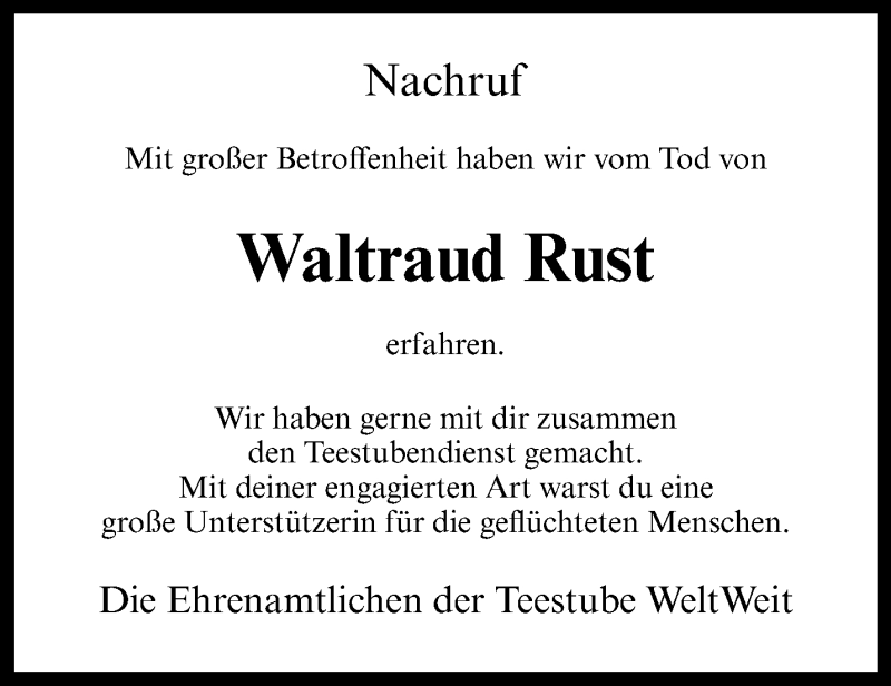 Hier finden Sie alle Traueranzeigen aus der Zeitung, die bisher für Waltraud Rust erschienen sind. Weitere Traueranzeigen, die in der Zeitung erscheinen, werden hier ebenfalls aufgelistet