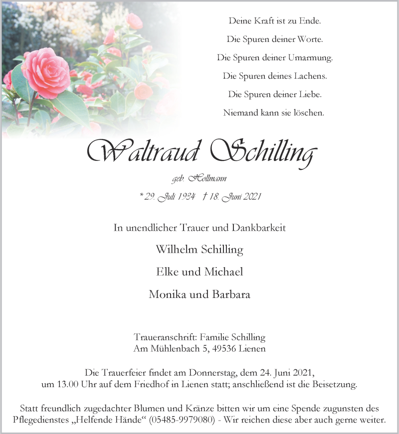 Hier finden Sie alle Traueranzeigen aus der Zeitung, die bisher für Waltraud Schilling erschienen sind. Weitere Traueranzeigen, die in der Zeitung erscheinen, werden hier ebenfalls aufgelistet