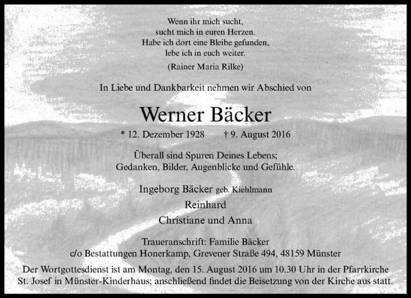 Hier finden Sie alle Traueranzeigen aus der Zeitung, die bisher für Werner Bäcker erschienen sind. Weitere Traueranzeigen, die in der Zeitung erscheinen, werden hier ebenfalls aufgelistet