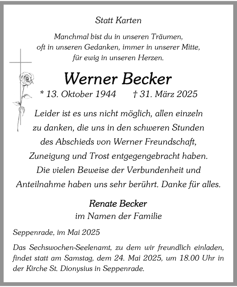 Hier finden Sie alle Traueranzeigen aus der Zeitung, die bisher für Werner Becker erschienen sind. Weitere Traueranzeigen, die in der Zeitung erscheinen, werden hier ebenfalls aufgelistet