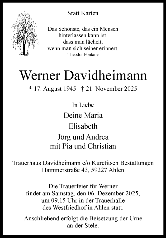 Hier finden Sie alle Traueranzeigen aus der Zeitung, die bisher für Werner Davidheimann erschienen sind. Weitere Traueranzeigen, die in der Zeitung erscheinen, werden hier ebenfalls aufgelistet