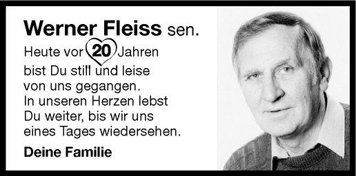 Hier finden Sie alle Traueranzeigen aus der Zeitung, die bisher für Werner Fleiss erschienen sind. Weitere Traueranzeigen, die in der Zeitung erscheinen, werden hier ebenfalls aufgelistet