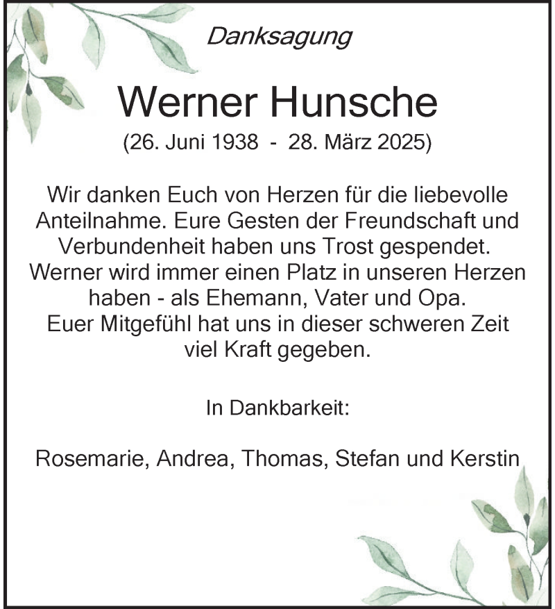 Hier finden Sie alle Traueranzeigen aus der Zeitung, die bisher für Werner Hunsche erschienen sind. Weitere Traueranzeigen, die in der Zeitung erscheinen, werden hier ebenfalls aufgelistet