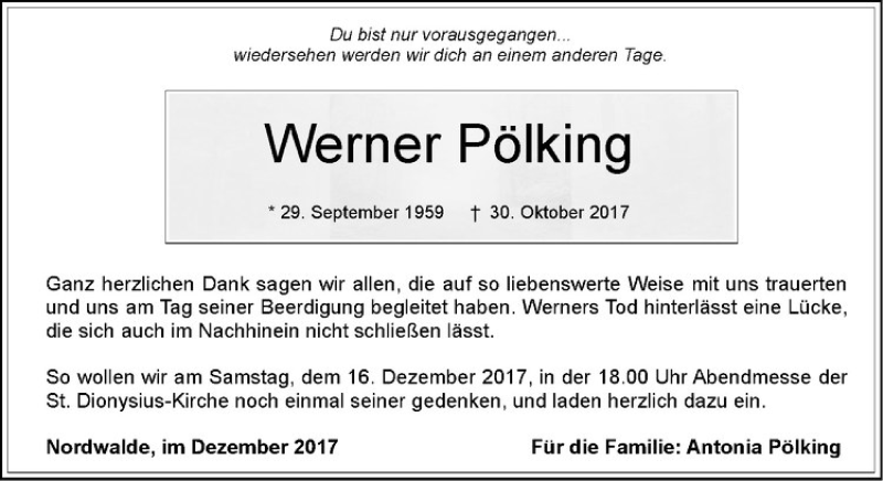 Hier finden Sie alle Traueranzeigen aus der Zeitung, die bisher für Werner Pölking erschienen sind. Weitere Traueranzeigen, die in der Zeitung erscheinen, werden hier ebenfalls aufgelistet