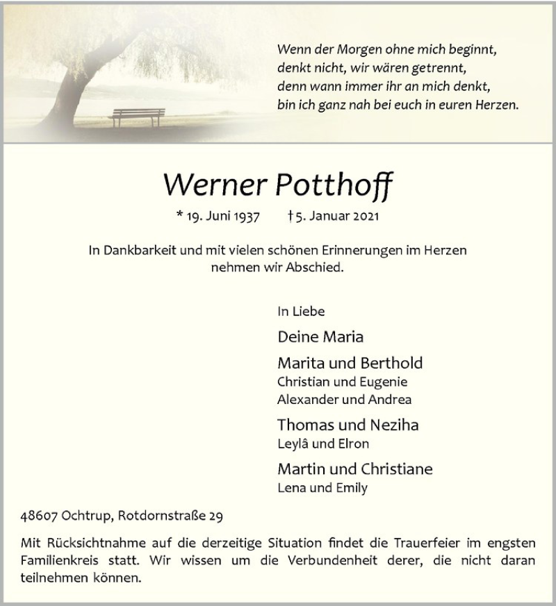 Hier finden Sie alle Traueranzeigen aus der Zeitung, die bisher für Werner Potthoff erschienen sind. Weitere Traueranzeigen, die in der Zeitung erscheinen, werden hier ebenfalls aufgelistet