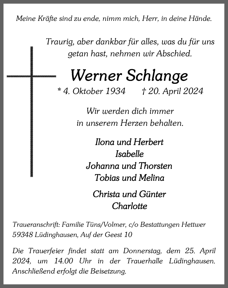 Hier finden Sie alle Traueranzeigen aus der Zeitung, die bisher für Werner Schlange erschienen sind. Weitere Traueranzeigen, die in der Zeitung erscheinen, werden hier ebenfalls aufgelistet