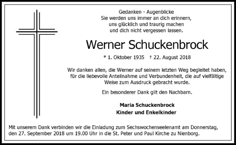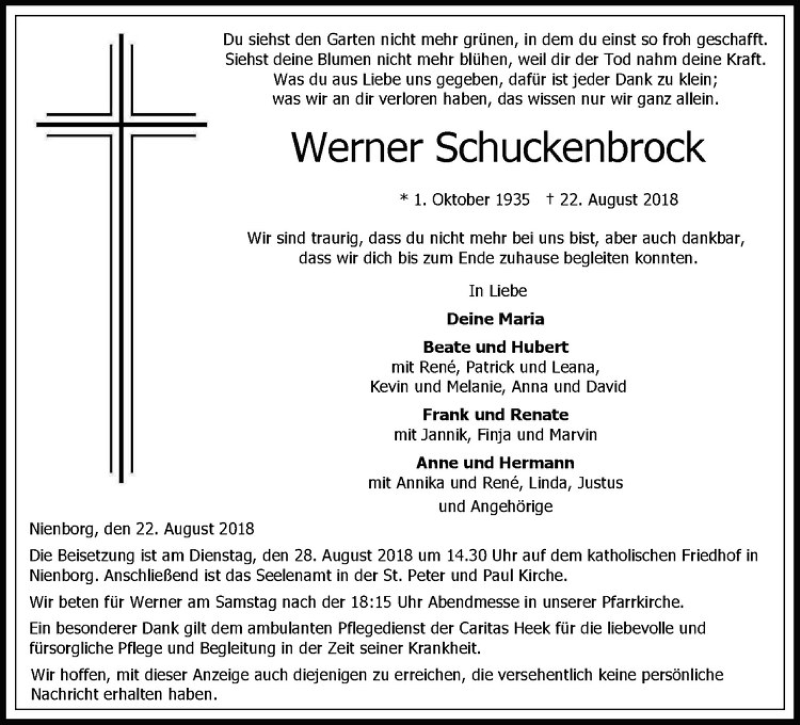 Hier finden Sie alle Traueranzeigen aus der Zeitung, die bisher für Werner Schuckenbrock erschienen sind. Weitere Traueranzeigen, die in der Zeitung erscheinen, werden hier ebenfalls aufgelistet