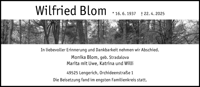 Hier finden Sie alle Traueranzeigen aus der Zeitung, die bisher für Wilfried Blom erschienen sind. Weitere Traueranzeigen, die in der Zeitung erscheinen, werden hier ebenfalls aufgelistet