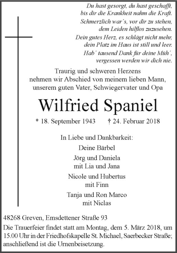 Hier finden Sie alle Traueranzeigen aus der Zeitung, die bisher für Wilfried Spaniel erschienen sind. Weitere Traueranzeigen, die in der Zeitung erscheinen, werden hier ebenfalls aufgelistet