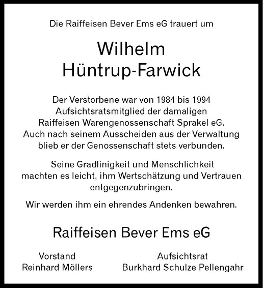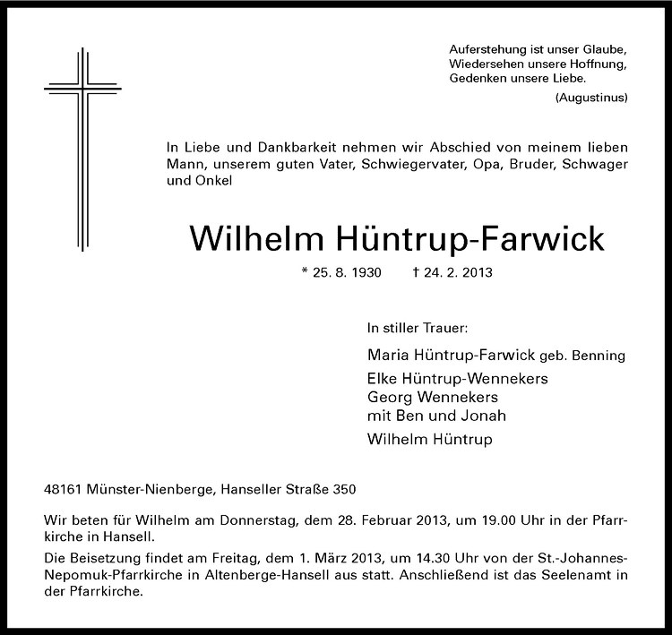 Hier finden Sie alle Traueranzeigen aus der Zeitung, die bisher für Wilhelm Hüntrup-Farwick erschienen sind. Weitere Traueranzeigen, die in der Zeitung erscheinen, werden hier ebenfalls aufgelistet