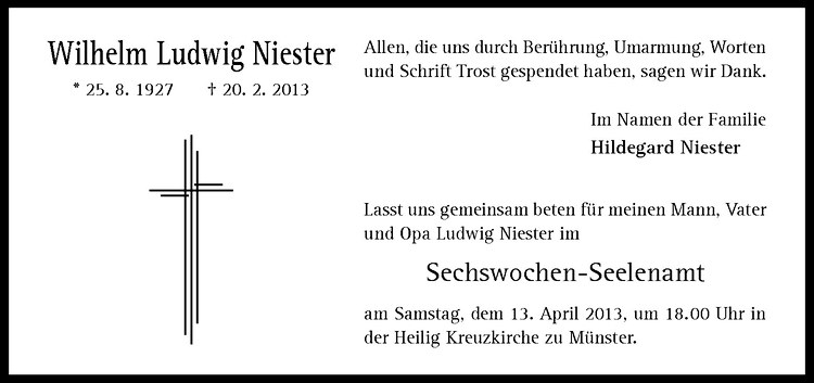Hier finden Sie alle Traueranzeigen aus der Zeitung, die bisher für Wilhelm Ludwig Niester erschienen sind. Weitere Traueranzeigen, die in der Zeitung erscheinen, werden hier ebenfalls aufgelistet