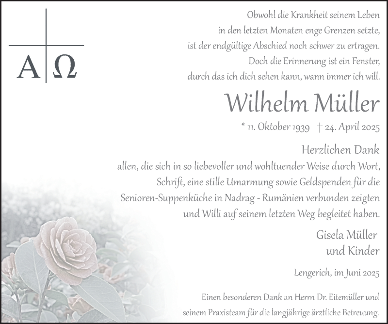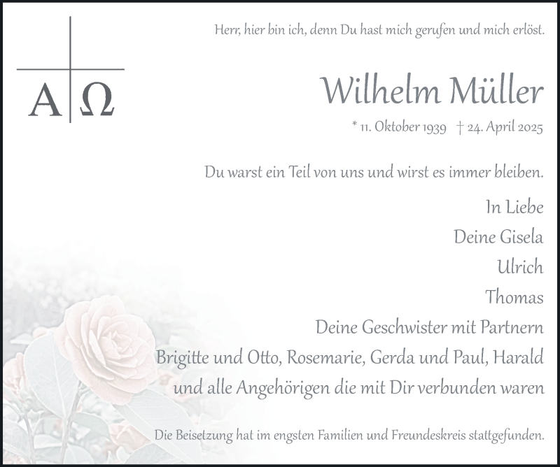Hier finden Sie alle Traueranzeigen aus der Zeitung, die bisher für Wilhelm Müller erschienen sind. Weitere Traueranzeigen, die in der Zeitung erscheinen, werden hier ebenfalls aufgelistet