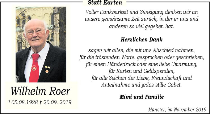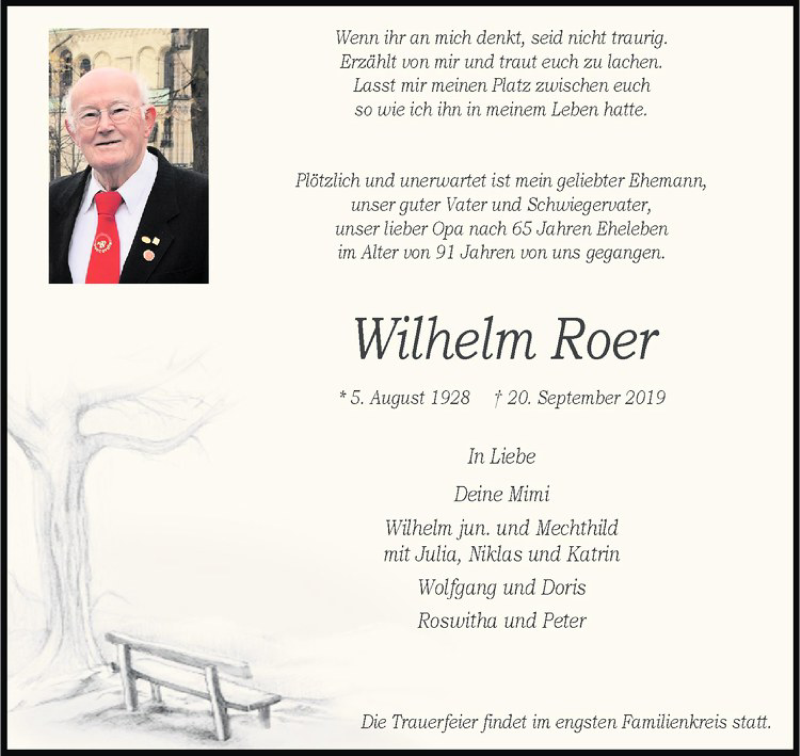 Hier finden Sie alle Traueranzeigen aus der Zeitung, die bisher für Wilhelm Roer erschienen sind. Weitere Traueranzeigen, die in der Zeitung erscheinen, werden hier ebenfalls aufgelistet