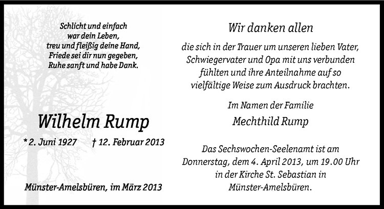 Hier finden Sie alle Traueranzeigen aus der Zeitung, die bisher für Wilhelm Rump erschienen sind. Weitere Traueranzeigen, die in der Zeitung erscheinen, werden hier ebenfalls aufgelistet