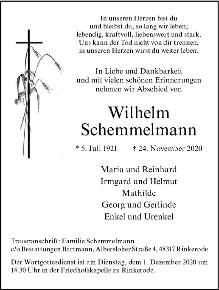 Hier finden Sie alle Traueranzeigen aus der Zeitung, die bisher für Wilhelm Schemmelmann erschienen sind. Weitere Traueranzeigen, die in der Zeitung erscheinen, werden hier ebenfalls aufgelistet