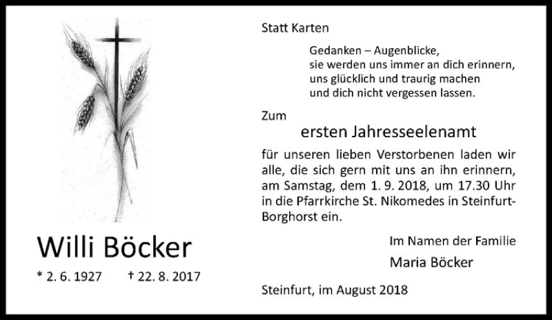 Hier finden Sie alle Traueranzeigen aus der Zeitung, die bisher für Willi Böcker erschienen sind. Weitere Traueranzeigen, die in der Zeitung erscheinen, werden hier ebenfalls aufgelistet