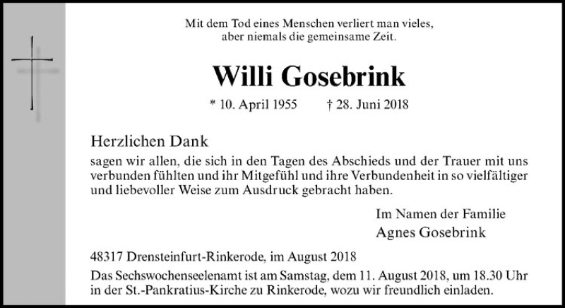 Hier finden Sie alle Traueranzeigen aus der Zeitung, die bisher für Willi Gosebrink erschienen sind. Weitere Traueranzeigen, die in der Zeitung erscheinen, werden hier ebenfalls aufgelistet