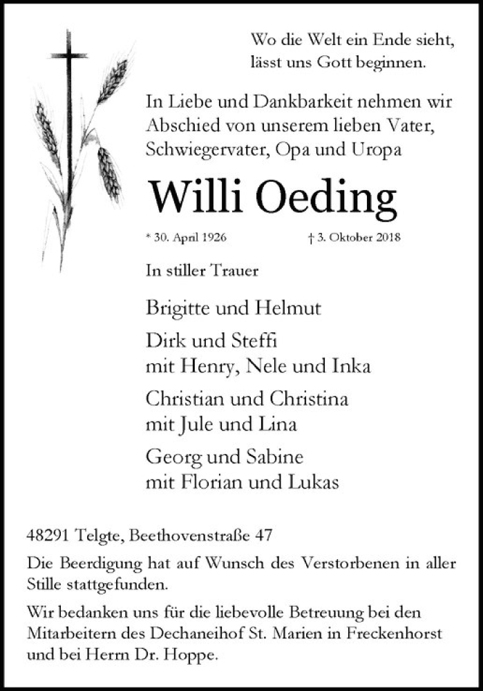 Hier finden Sie alle Traueranzeigen aus der Zeitung, die bisher für Willi Oeding erschienen sind. Weitere Traueranzeigen, die in der Zeitung erscheinen, werden hier ebenfalls aufgelistet