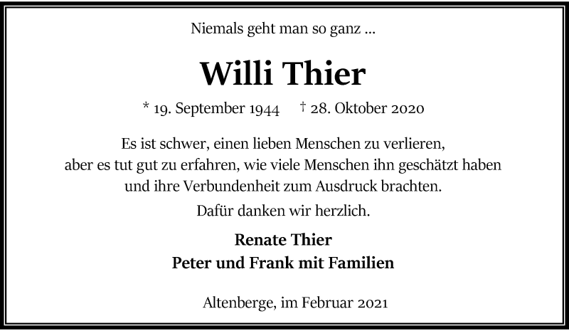 Hier finden Sie alle Traueranzeigen aus der Zeitung, die bisher für Willi Thier erschienen sind. Weitere Traueranzeigen, die in der Zeitung erscheinen, werden hier ebenfalls aufgelistet