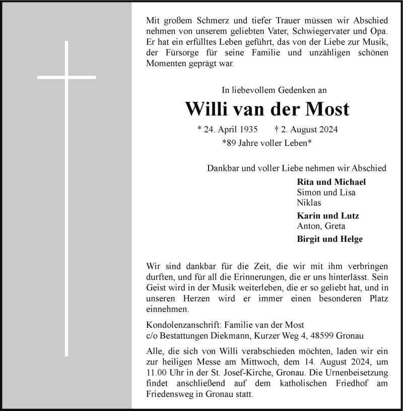 Hier finden Sie alle Traueranzeigen aus der Zeitung, die bisher für Willi van der Most erschienen sind. Weitere Traueranzeigen, die in der Zeitung erscheinen, werden hier ebenfalls aufgelistet