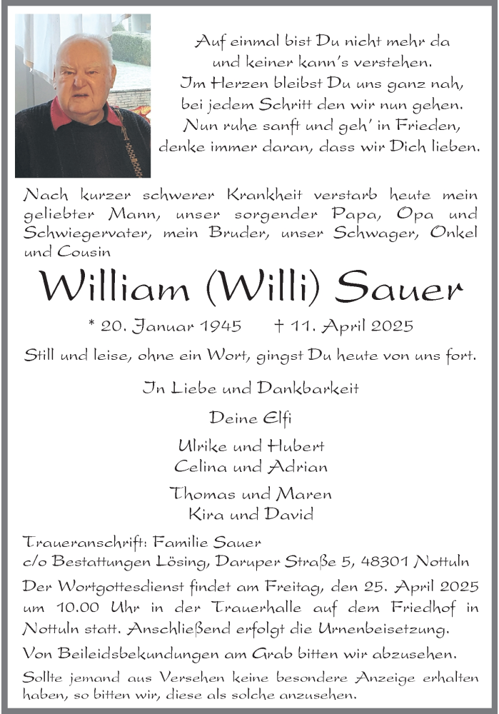 Hier finden Sie alle Traueranzeigen aus der Zeitung, die bisher für William Sauer erschienen sind. Weitere Traueranzeigen, die in der Zeitung erscheinen, werden hier ebenfalls aufgelistet
