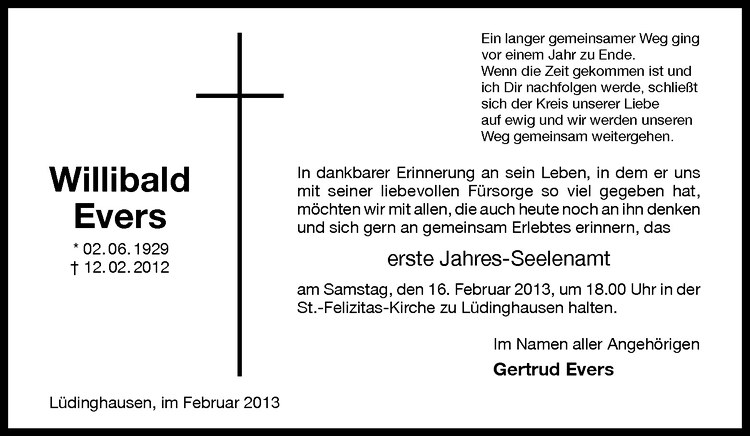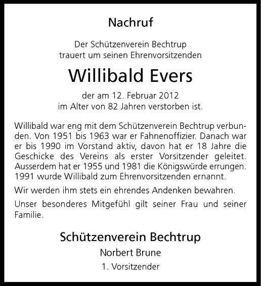 Hier finden Sie alle Traueranzeigen aus der Zeitung, die bisher für Willibald Evers erschienen sind. Weitere Traueranzeigen, die in der Zeitung erscheinen, werden hier ebenfalls aufgelistet